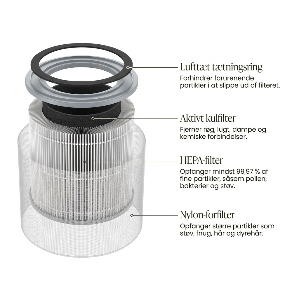 Luftrenseren er udstyret med et HEPA-baseret filter, som kan opfange op til 99,97 % af partikler ned til 0,3 mikrometer, hvilket gør den særligt velegnet til hjem med allergikere eller kæledyr.